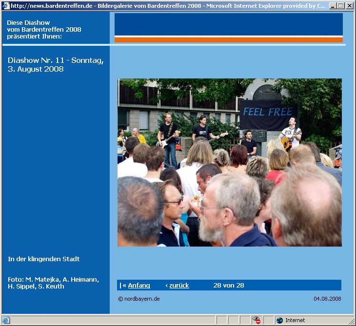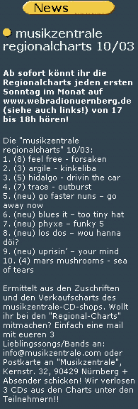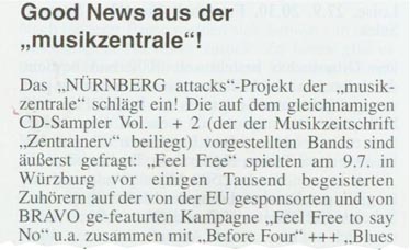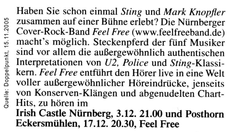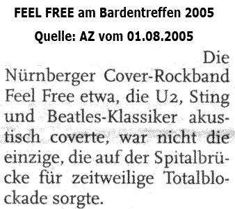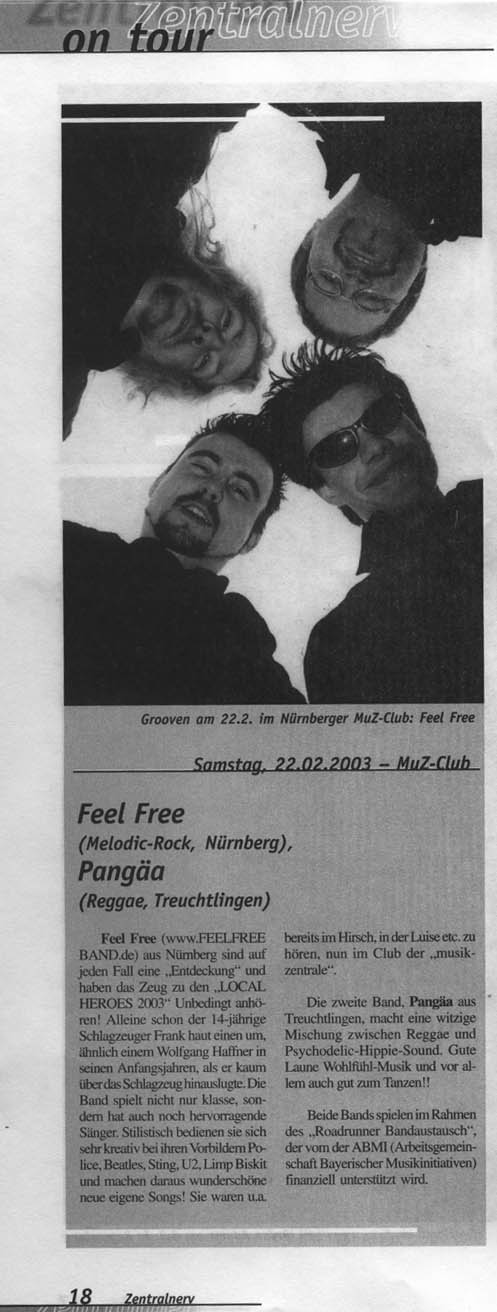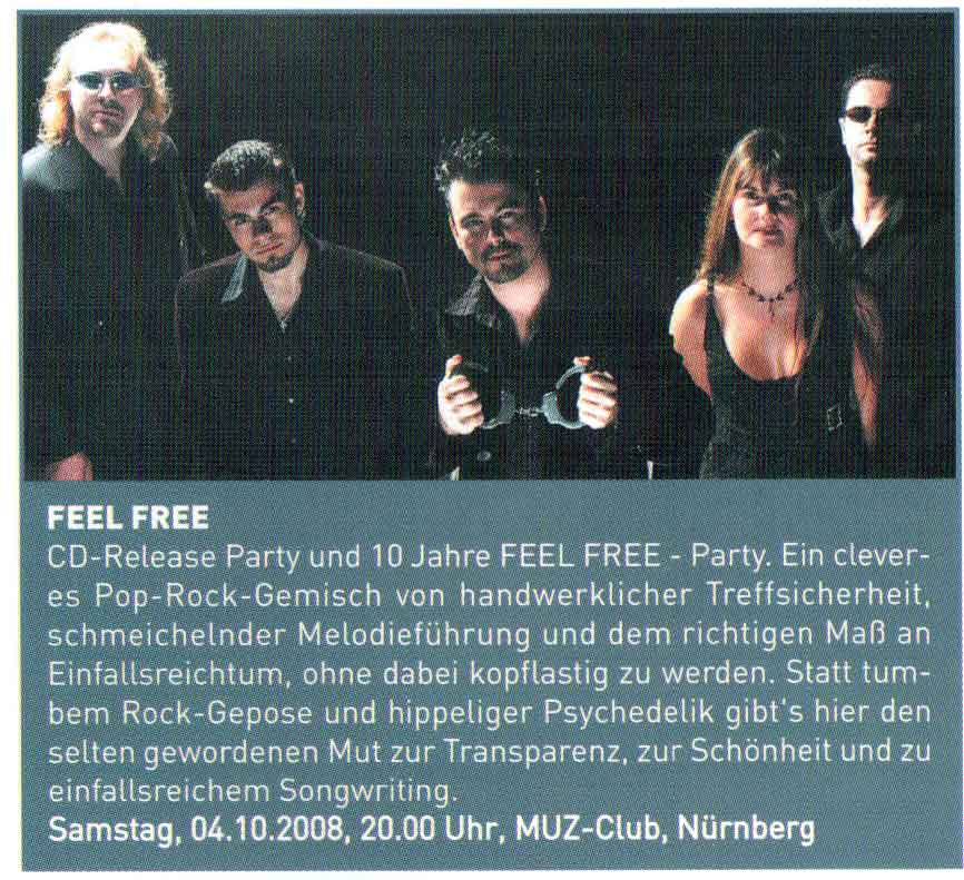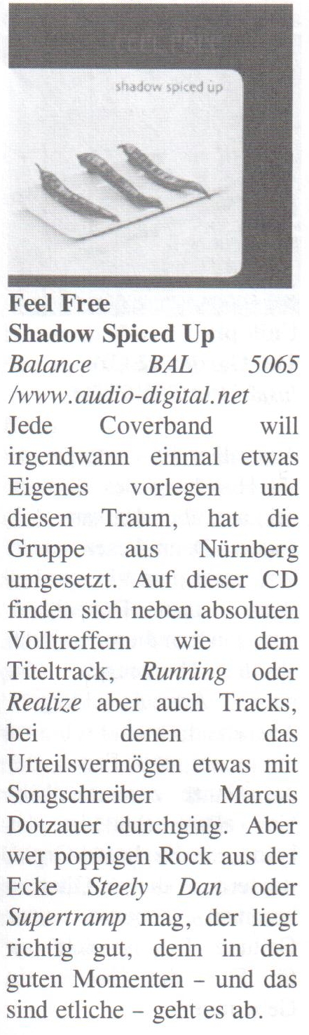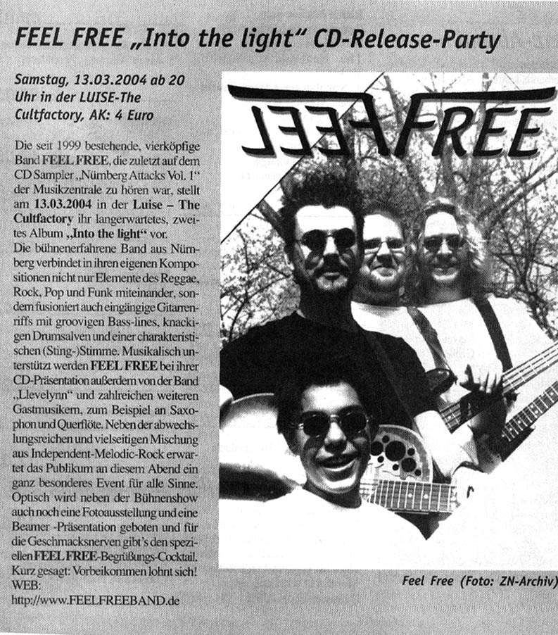 Hinter jedem Akkord ein neues Klangerlebnis, kribbelnde Gänsehaut, die den Nacken hinauf kriecht - ein wirklich guter Song setzt Emotionen frei, nistet sich im Kopf und im Gehörgang ein - so wie die Eigenkompositionen von FEEL FREE, die sich bis dato auf zwei Alben ("Out of the shadow" und "Into the light") wieder finden.