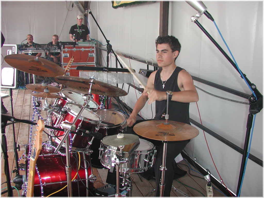 Natürlich hat er dann im zarten Alter von 7 Jahren ein echtes Drumset bekommen! Das war aber schnell reif für den Sperrmüll! Darum hat er mit 11 dann sein Set erhalten mit dem er nun im Übungsraum unsre Trommelfelle strapaziert. Gleichzeitig verblüfft er uns aber auch immer wieder mit seinem Talent und seiner schnellen Auffassungsgabe und schmückt so manches Pattern gerne spontan virtuos aus! Wenn wir dann äußern, dass da eigentlich nur ein normaler Rockrhythmus hingehört kriegen wir gleich unser Fett weg - Zitat: 'Bähh, des is ja langweilig!!'
