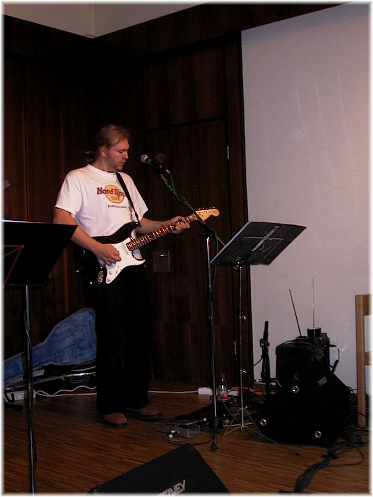 Den Start machte er bei der Schulband, wo er nebenbei noch etwas Allgemeinwissen angehäuft hat. Unser 'Nordmann' verblüfft uns immer wieder mit seinen lustigen und oft trockenen gewählten Ausdrucksformen (z.B. 'Haben Sie das zubereitet?' zu einer hübschen Kellnerin, die uns einen leckeren Nachtisch servierte!). Er übt aber auch etwas den hier üblichen Dialekt.